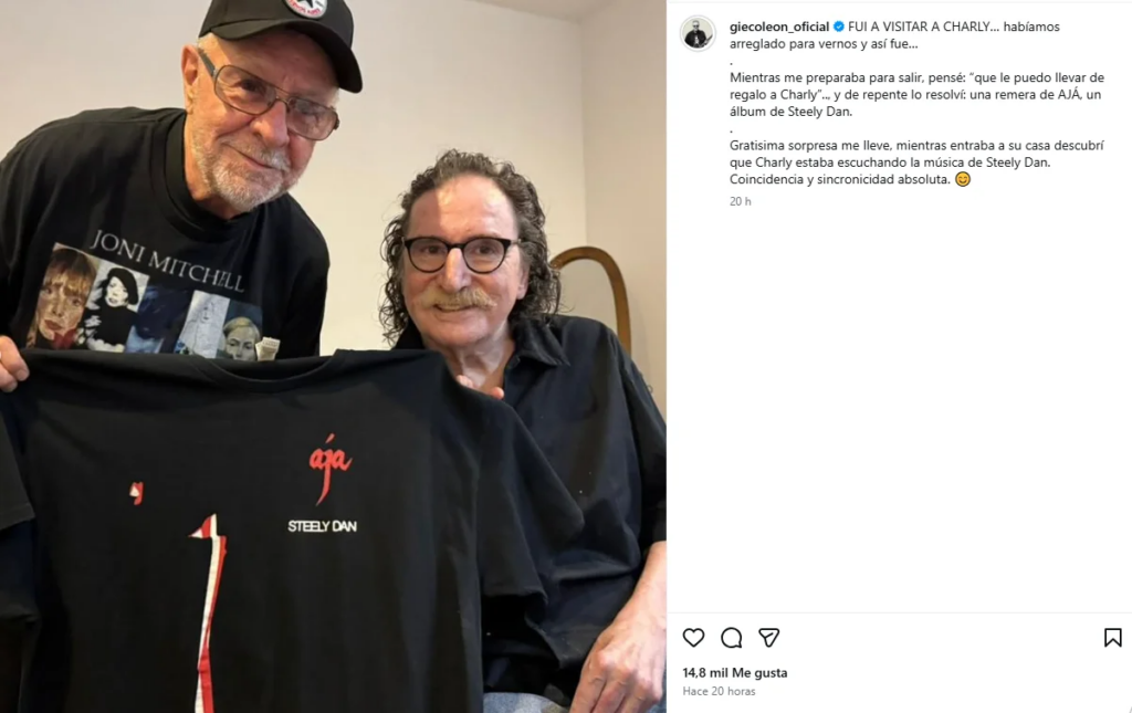 La respuesta llegó casi de inmediato: una remera de “Aja”, el icónico álbum de Steely Dan. Sin imaginar lo que sucedería minutos después, llegó a la casa de Charly y se encontró con una escena inesperada. “Grata sorpresa me llevé, mientras entraba a su casa descubrí que Charly estaba escuchando la música de Steely Dan. Coincidencia y sincronicidad absoluta”, relató en su posteo.